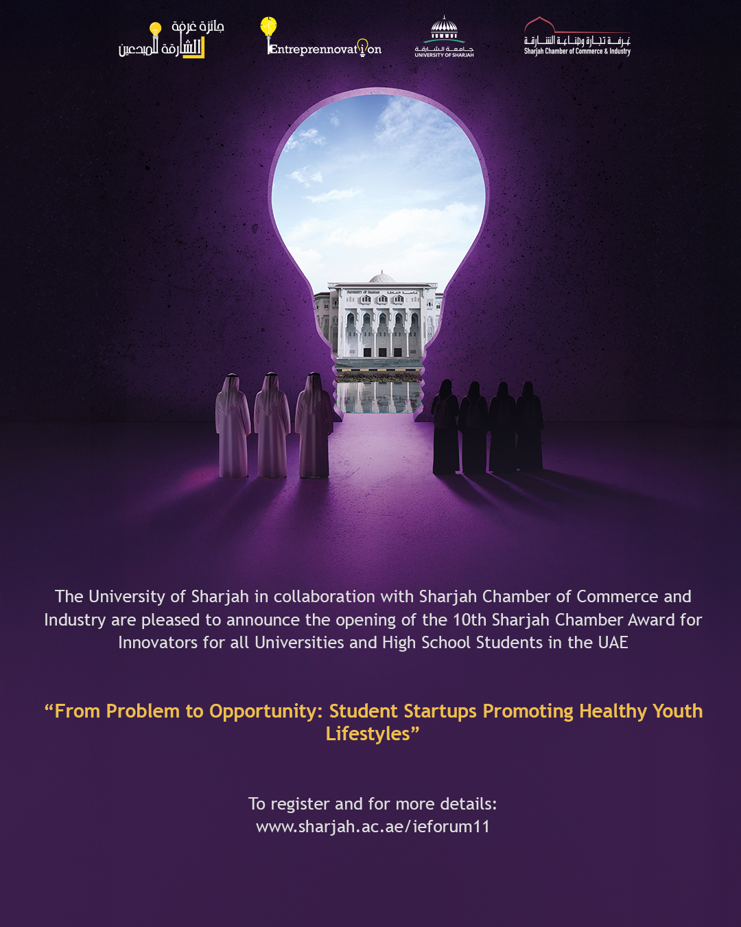 The University of Sharjah in collaboration with the Sharjah Chamber of Commerce and Industry are excited to announce the opening of the 10th Sharjah Chamber Award for Innovators that is under the umbrella of the 11th International Forum on Innovation and Entrepreneurship. Both the forum and the award aim to embed innovation culture and entrepreneurial mindset amongst the youth by making them able to identify important problems affecting our societies and create innovative solutions that can be turned into entrepreneurial ventures.